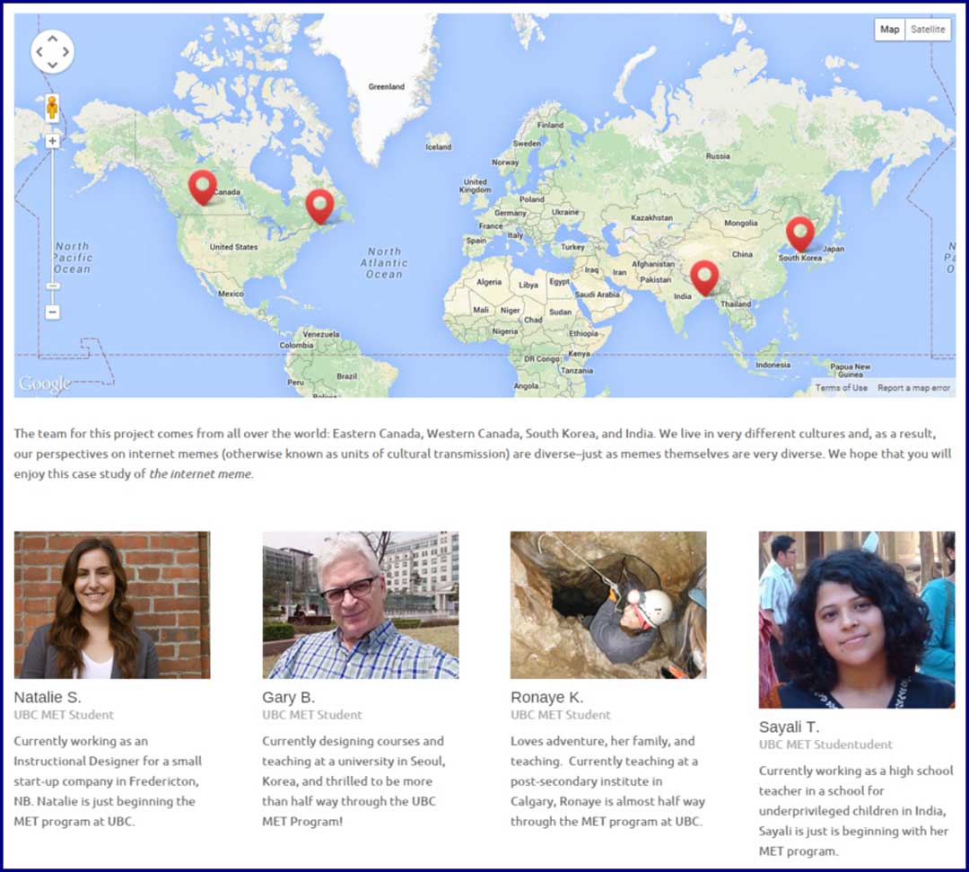 The ability to form working partnerships in business and education is crucial–especially today, with technology making it both necessary and easy to cross boundaries, pool resources, and share expertise with one another. One of the most productive partnerships that I have ever experienced was with fellow MET student Caroline Kim Moore from Ottawa. In two separate courses we collaborated on four major assignments, as shown in the slider below.