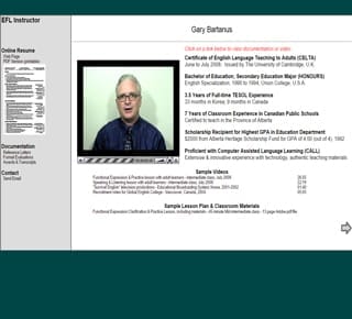 The first ePortfolio to include actual artifacts (videos of CELTA lessons and sample lesson plans) as well as the usual resume. (Password Protected)